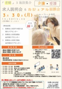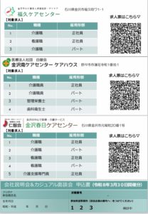 2026.03.04 求人説明会&カジュアル面談会inハローワーク金沢 このたび、3月30日(月)に「求人説明会&カジュアル面談会 in ハローワーク金沢」 を開催いたします。 当日は3施設合同で、仕事内容や職場の雰囲気、働き方などを直接ご説明いたします。履歴書は不要です。まずは話を聞いてみたいという方も大歓迎です。 転職をお考えの方、福祉・介護の仕事にご興味のある方、ぜひお気軽にお越しください。詳細はチラシをご覧ください。 皆さまのご参加を心よりお待ちしております。 << 前のページ 一覧へ戻る 次のページ >> カテゴリー お知らせ (83) お部屋の空き状況 (45) アーカイブ 2026年3月 (4) 2026年2月 (2) 2026年1月 (3) 2025年12月 (3) 2025年11月 (2) 2025年10月 (2) 2025年9月 (3) 2025年8月 (5) 2025年7月 (2) 2025年6月 (2) 2025年5月 (2) 2025年4月 (3) 2025年3月 (3) 2025年2月 (2) 2025年1月 (3) 2024年12月 (4) 2024年11月 (4) 2024年10月 (5) 2024年9月 (6) 2024年8月 (2) 2024年7月 (6) 2024年6月 (3) 2024年5月 (3) 2024年4月 (2) 2024年3月 (3) 2024年2月 (4) 2024年1月 (8) 2023年12月 (4) 2023年11月 (5) 2023年10月 (3) 2023年9月 (1) 2023年8月 (2) 2023年7月 (3) 2023年6月 (8) 2023年4月 (2) 2023年3月 (1) 2023年2月 (2) 2023年1月 (3) Service サービス一覧 症状の安定した方が看護・介護を受けながらリハビリを行い、家庭復帰を目指す施設です。 入所サービス 病気や怪我が安定した状態にある方へ、 自宅で生活できるよう食事・入浴・リハビリなどの サービスを提供します。また、踊りや歌謡など 色々な催し物も行われます。 詳細を見る 01 日頃の様子 利用料金 センター内設備紹介 ショートステイ 一時的に短期間入所できるサービスです 詳細を見る 02 通所リハビリ 入浴や食事、リハビリを行う送迎付きの日帰りサービスです 詳細を見る 03 訪問リハビリ 安心してご自宅で長く暮らせるお手伝いをさせて頂きます 詳細を見る 04 居宅介護支援事業所 介護の必要な方やご家族の身近な相談窓口です 詳細を見る 05 地域包括支援センターふくひさ 在宅生活や介護に関する相談等に応じます 詳細を見る 06 サービス一覧